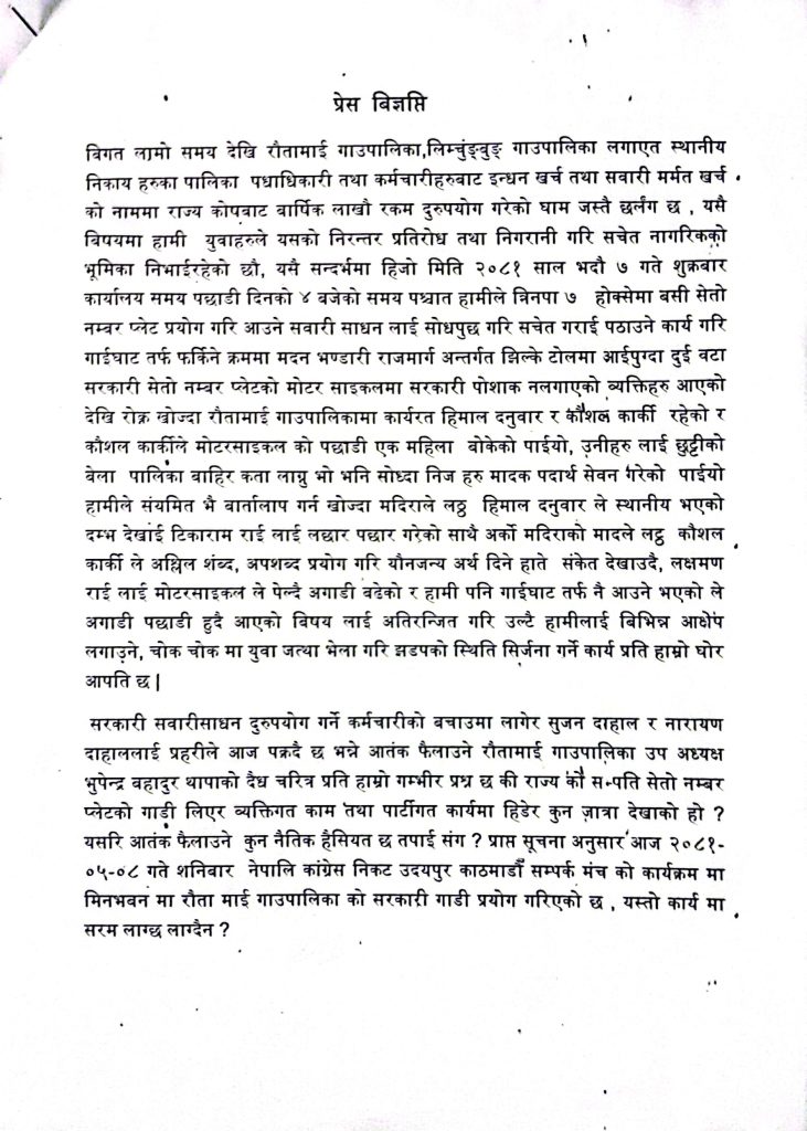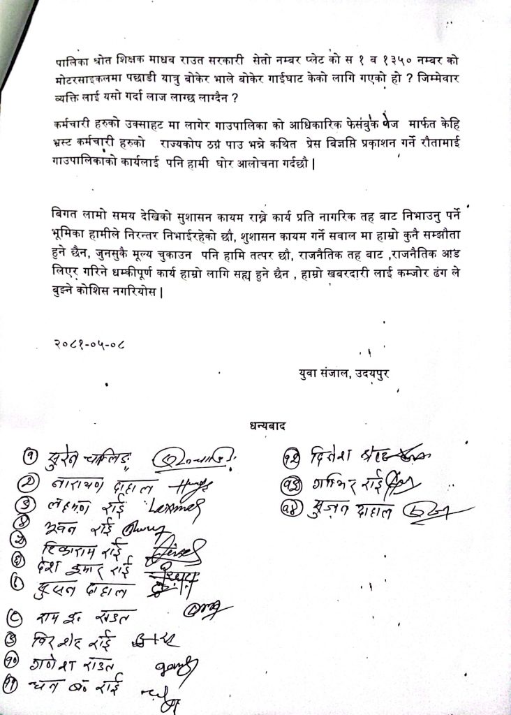 स्थानीय युवाहरुले सरकारी सवारीको दुरुपयोगमा संलग्न कर्मचारीहरूलाई तत्काल कारवाहीको माग गर्दै, केही राजनीतिक दलको आडमा धम्कीदिने कर्मचारी र भ्रष्टाचारको विरोधमा निरन्तर संघर्ष गर्ने समेत विज्ञप्तीमा उल्लेख छ । जारी विज्ञप्तीमा एक दर्जनभन्दा बढी स्थानीय युवाहरुले हस्ताक्षर गरेका छन् ।