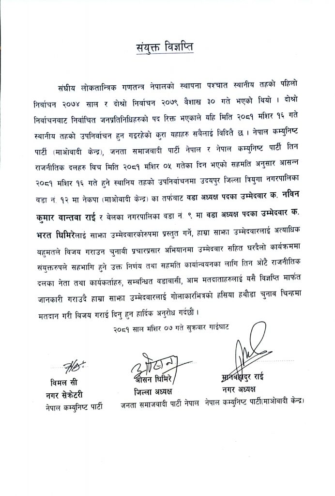 उदयपुरमा जसपा र नेकपाको सहयोग माओवादी केन्द्रको उम्मेदवारहरुलाई (विज्ञप्ती सहित)