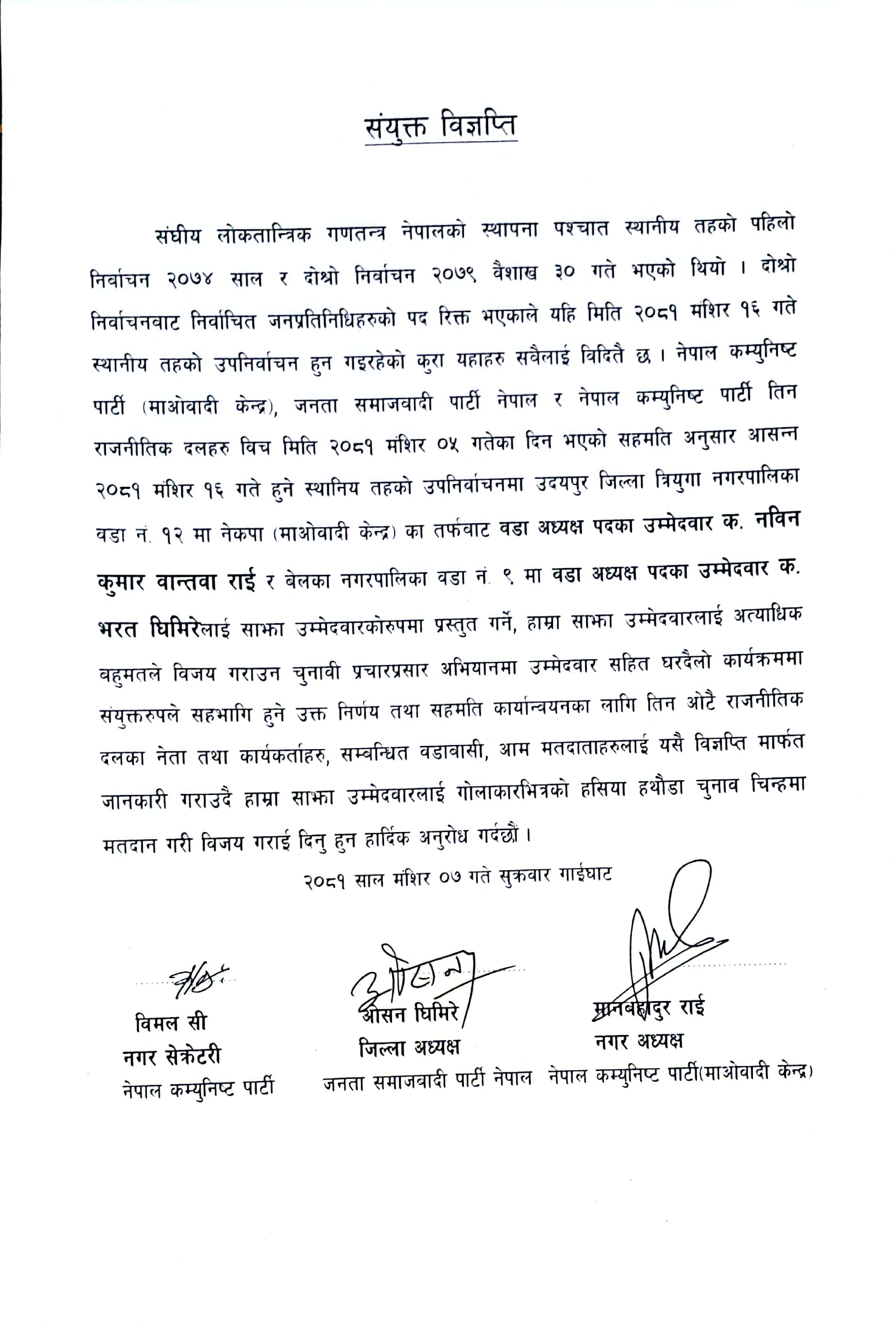 विज्ञप्तिमा माओवादी केन्द्रका त्रियुगा नगरपालिका वडा नम्बर १२ का वडा अध्यक्ष पदका उम्मेदवार नविन कुमार वान्तवा राई र बेलका नगरपालिका वडा नम्बर ९ का वडा अध्यक्ष पदका उम्मेदवार भरत घिमिरेलाई साझा उम्मेदवारको रूपमा प्रस्तुत गरिएको छ । सो उम्मेदवारहरुलाई निर्वाचनमा मतदान गर्न सम्पूर्ण मतदाताहरूसँग अपिल समेत गरिएको छ ।